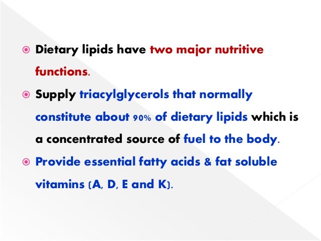 They are important dietary constituents not only because of their high energy value but also because of the fat soluble vitamins and the essential fatty acids contained in the fat of natural foods. Dietary lipids have two major nutritive functions. Biological importance of lipids. Supply triacylglycerols that normally constitute about 90 of dietary lipids which is a.