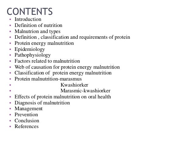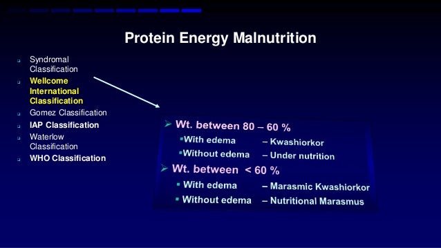 Protein energy malnutrition pem manifests intwo differentforms. Prevalence protein energy malnutrition is a basic lack of food from famine and a major cause of infant mortality and morbidity worldwide protein energy malnutrition caused 0 46 of all deaths worldwide in 2002 an average of 42 deaths per million people per year. Management mild and moderate malnutrition mainstay of treatment is to give adequate amounts of protein and energy atleast 150kcal kg day protein intake of 3g kg day best measure of efficacy of the treatment is weight gain 34. Kwashiorkor common in childrenbelow 3yrs onset is more between18months to 24months protein deficiency only 14.