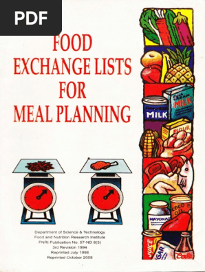 The food and nutrition research institute dost fnri is committed to its mandate of diffusing information to various stakeholders and clients. Food exchange lists for meal planning 4th edition the food exchange lists fel for meal planning is one of the basic tools in nutrition and dietetics. The following pages separate foods into these seven groups.
